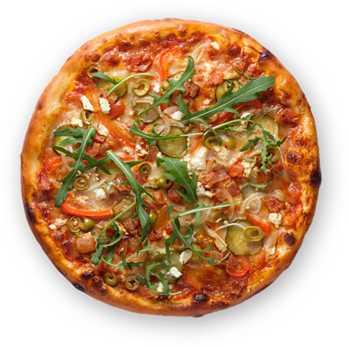 Тесто пицца, Соус Пицца, Моцарелла, Перец сладкий, Оливки, Огурцы маринованные, Помидор, сыр фета, Руккола, Лук репчатый