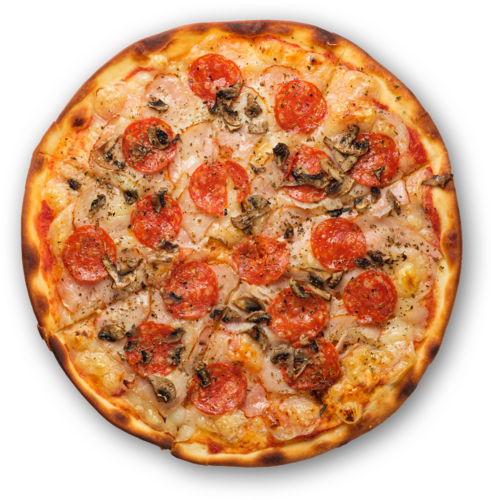 Тесто пицца, Соус Пицца, Моцарелла, Салями, Филе куриное, Опята маринованные, Томаты вяленные, Лук репчатый