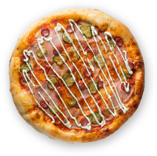 Тесто пицца, Соус Пицца, Моцарелла, Полендвичка, Грудинка В/К, Салями, Огурцы маринованные, Лук репчатый, Сметанно-чесночный соус