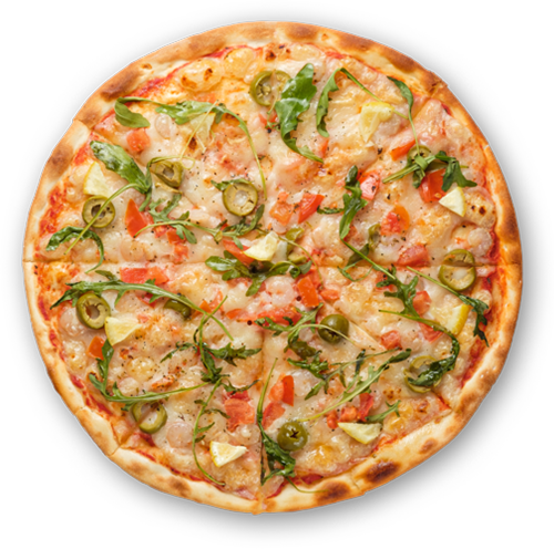 Тесто пицца, Соус Пицца, Моцарелла, Креветки Пицца, Помидор, Оливки, Руккола, Лимон