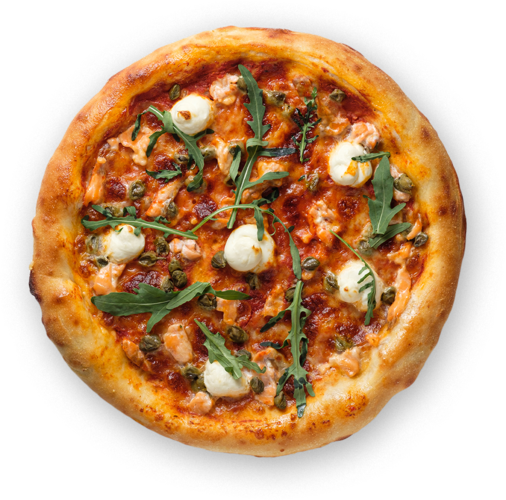 Тесто пицца, Соус Пицца, Моцарелла, Лосось, Сливочный сыр, Каперсы, Руккола
