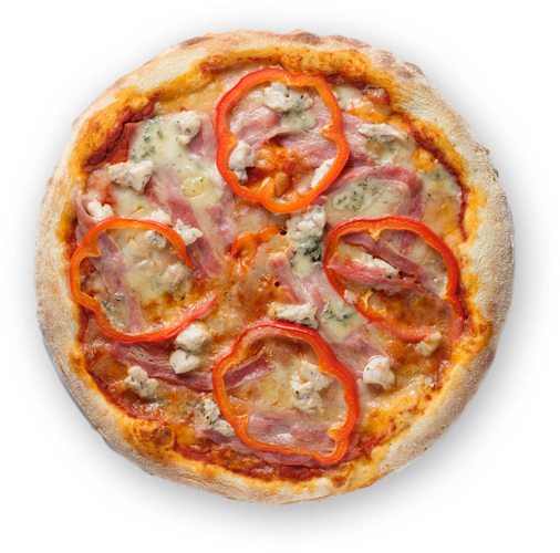 Тесто пицца, Соус пицца, Моцарелла, Грудинка В/К, Филе куриное, Дор блю, Перец сладкий