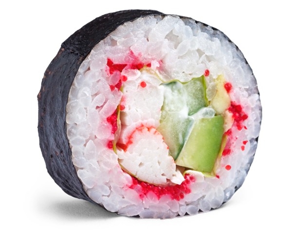 крабовые палочки, сливочный сыр, икра масаго, огурец, авокадо, рис, нори