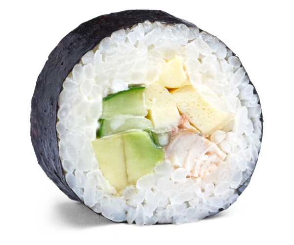 крабовые палочки, сливочный сыр, икра масаго, огурец, авокадо, рис, нори