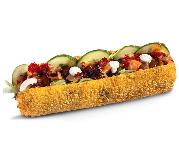 Сыр сливочный, Чесночный соус, Салат Айсберг, Огурец, Сурими, Острый соус, Соус терияки, Жареный лук, Панировка, Рис, Нори