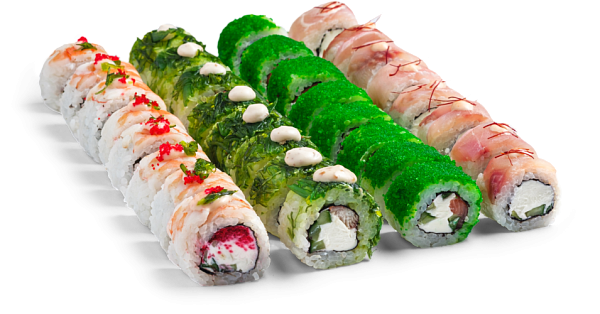 Ролл с авокадо, Ролл с угрем, Ролл с тунцом, Ролл с томаго, Ролл с огурцом, Ролл с лососем, Ролл с креветкой, Ролл с копчёным лососем, Имбирь, Васаби, Соевый соус