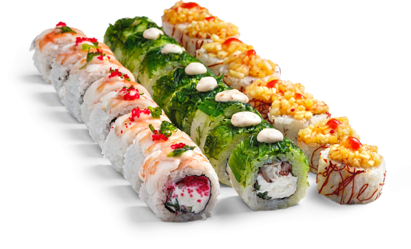 Ролл с авокадо, Ролл с угрем, Ролл с тунцом, Ролл с томаго, Ролл с огурцом, Ролл с лососем, Ролл с креветкой, Ролл с копчёным лососем, Имбирь, Васаби, Соевый соус
