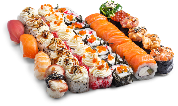 Ролл с авокадо, Ролл с угрем, Ролл с тунцом, Ролл с томаго, Ролл с огурцом, Ролл с лососем, Ролл с креветкой, Ролл с копчёным лососем, Имбирь, Васаби, Соевый соус