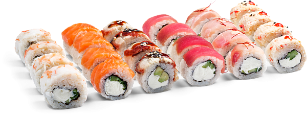 Ролл с авокадо, Ролл с угрем, Ролл с тунцом, Ролл с томаго, Ролл с огурцом, Ролл с лососем, Ролл с креветкой, Ролл с копчёным лососем, Имбирь, Васаби, Соевый соус