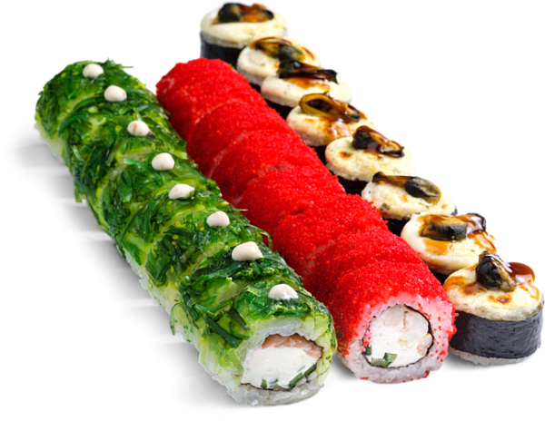 Ролл с авокадо, Ролл с угрем, Ролл с тунцом, Ролл с томаго, Ролл с огурцом, Ролл с лососем, Ролл с креветкой, Ролл с копчёным лососем, Имбирь, Васаби, Соевый соус
