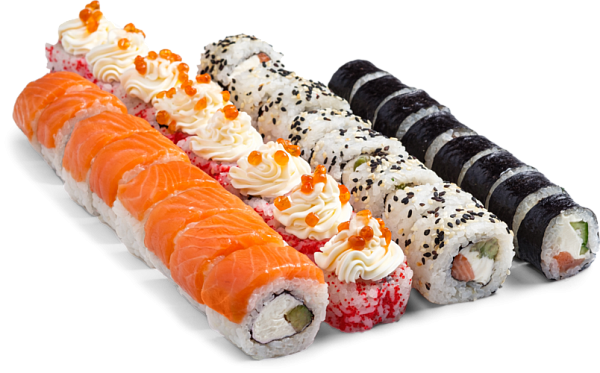 Гункан спайси Магуро, Гункан Икура, Филадельфия с авокадо, Эби, Унаги, Сяке, Магуро, Гункан Эби, Гункан Чука, Гункан Унаги, Сырный с лососем, Сырный с угрем, Токио, Гункан спайси Сяке, Васаби, Соевый соус, Имбирь