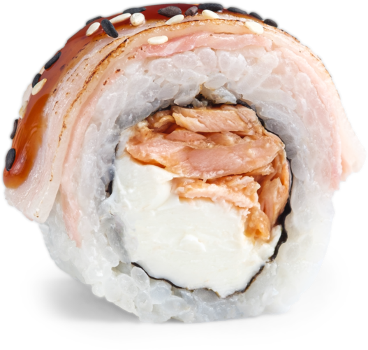 лосось терияки, бекон, сливочный сыр, рис, нори, кунжут, терияки соус