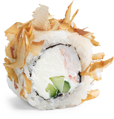 креветки тигровые, огурец, сливочный сыр, стружка тунца, рис, нори