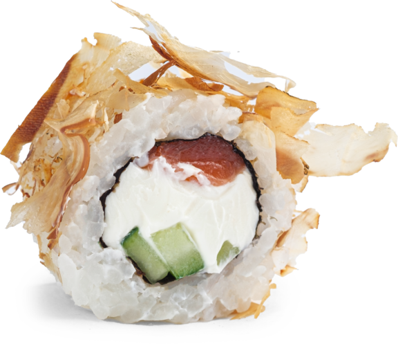 лосось терияки, сливочный сыр, огурец, стружка тунца, рис, нори