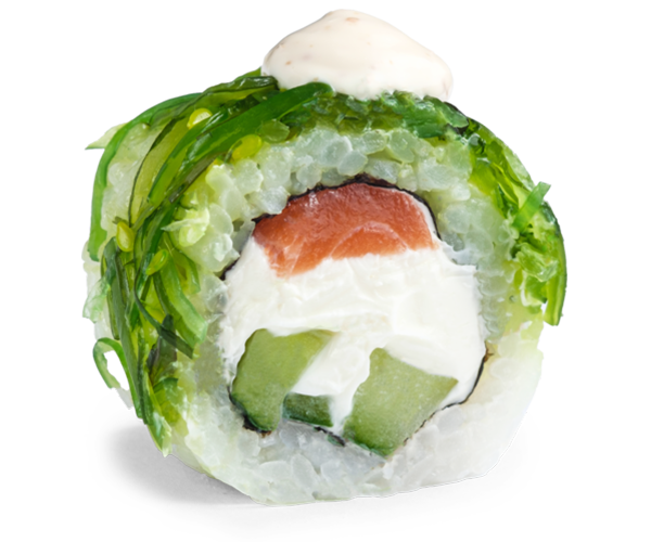 лосось, сливочный сыр, огурец, чука салат, соус кунжутный, рис, нори