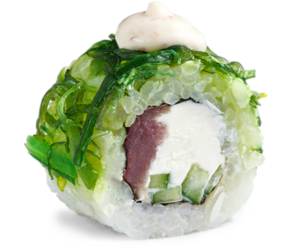 тунец, сливочный сыр, огурец, чука салат, соус кунжутный, рис, нори