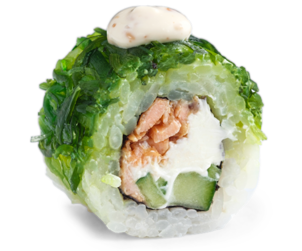 лосось, сливочный сыр, огурец, чука салат, соус кунжутный, рис, нори