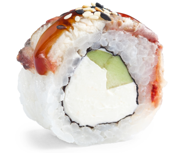 угорь жареный, сливочный сыр, авокадо, терияки соус, кунжут, рис, нори