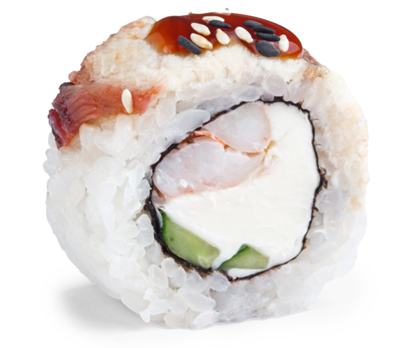 угорь жареный, креветки тигровые, сливочный сыр, огурец, соус терияки, кунжут, рис, нори