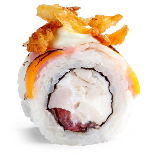 помидор, сыр филадельфия, сыр чеддер ломтевой, филе куриное, грудинка В/К, лук жареный, сметанно-чесночный соус, рис, нори