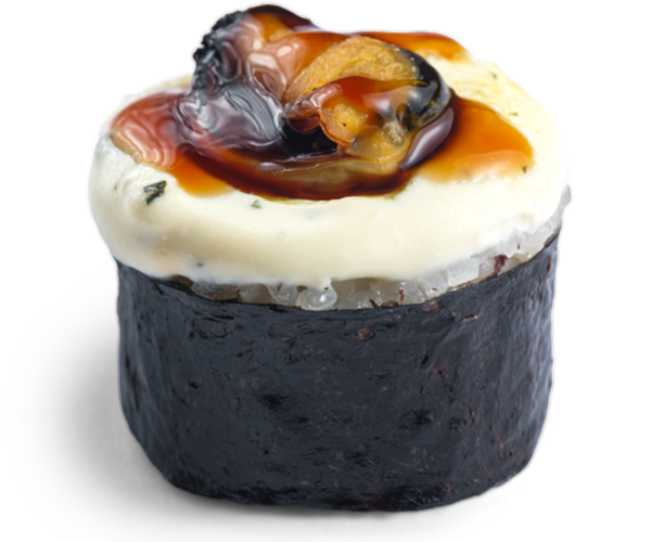 мидии, сливочный сыр, айсберг, помидор, огурец, сметанно-чесночный соус, рис, нори